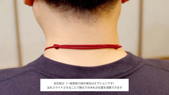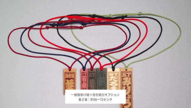 「首掛け用のフダヤ手組(+990税込)」は「自在結び あり(+110税込)・なし」どちらの設定もございますが、木札の根元から組み上げるため単品や追加での購入はできません。カラーバリエーションは「一般首掛け紐」と同様です。